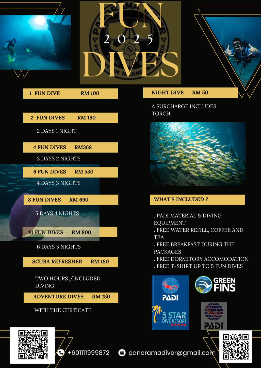 o A/C ROOMS are RM150 per night for the duration of the coursePanorama Diver only reserve rooms for those who are taking one of our Dive packages. For ROOM bookings only, please call Office: +60 19-960-8630 (Masron)